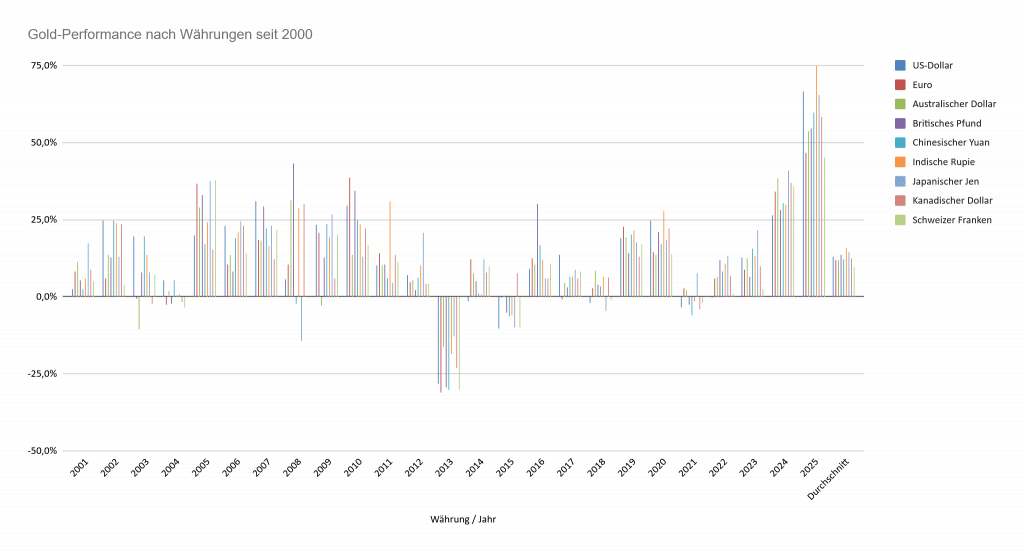 Über einen Zeitraum von rund 25 Jahren erzielte Gold nicht nur in US-Dollar, sondern in nahezu allen großen Währungen eine durchschnittliche Rendite von rund 10 % pro Jahr. In Ländern mit massivem Vertrauensverlust in die eigene Währung – etwa Türkei oder Argentinien – fiel die Wertentwicklung sogar um ein Vielfaches höher aus.