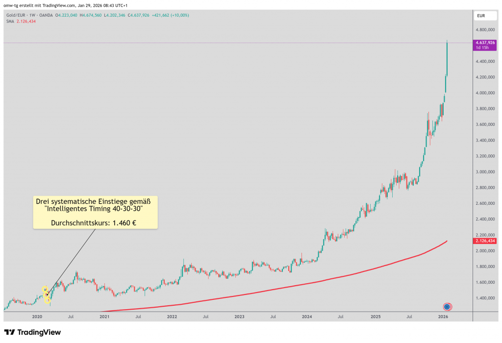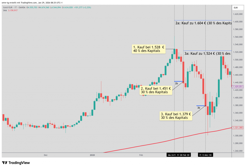 Erfolgte dieser bei 1.400 €, würde der dritte Kauf bei 1.300 € oder 1.500 € pro Unze vorgenommen werden.