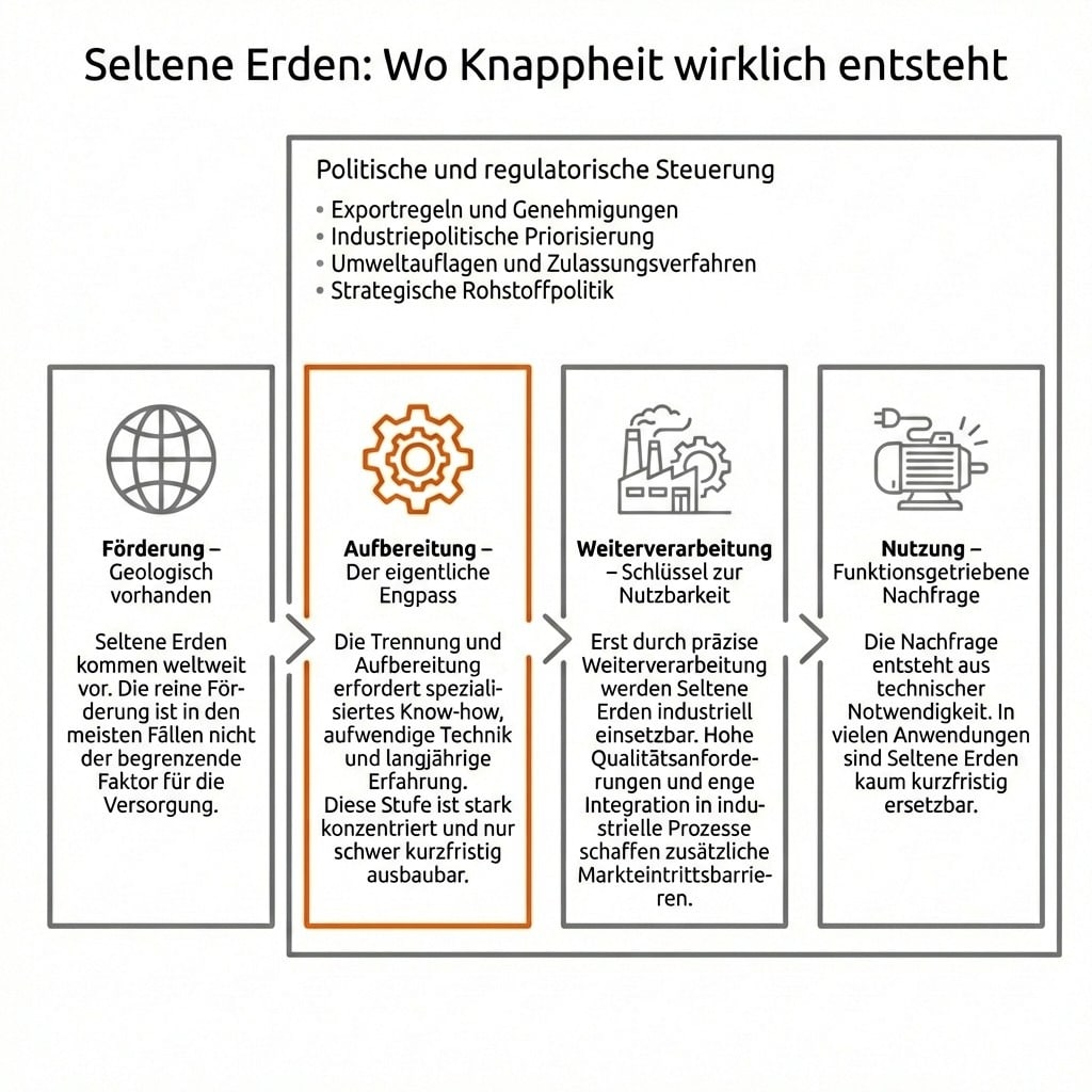 Bei Seltenen Erden entsteht Knappheit nicht im Boden. Entscheidend ist vielmehr, ob ein Rohstoff so aufbereitet werden kann, dass ihn die Industrie tatsächlich einsetzen kann. Genau an dieser Stelle verengen sich viele dieser Märkte.